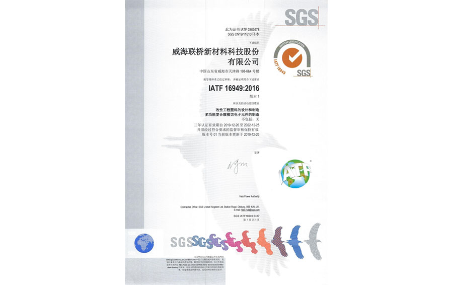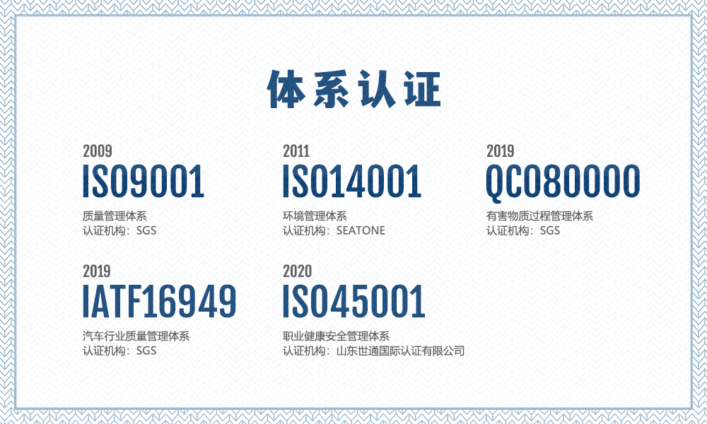 公司制定了“以質量創(chuàng)信譽,以服務爭客戶,以科技求創(chuàng)新,以改進促發(fā)展”的質量方針,建設了山東省工程實驗室、山東省企業(yè)技術中心、山東省“一企一技術”研發(fā)中心,通過了ISO9001質量管理體系、ISO14001環(huán)境管理體系、QC080000體系、IATF16949汽車體系、ISO45001職業(yè)健康管理體系及企業(yè)知識產(chǎn)權管理體系,兩化融合管理體系等認證,使公司產(chǎn)品質量達到國際化標準,為產(chǎn)品穩(wěn)定性提供強有力的體系保證。