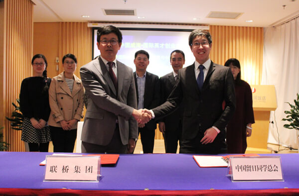 2017年3月5日,2017中國(guó)威?!?guó)際英才創(chuàng)業(yè)峰會(huì)海外博士(日本)威海行活動(dòng)開(kāi)幕。期間,聯(lián)橋集團(tuán)與中國(guó)留日同學(xué)總會(huì)簽訂了共建“中日高端人才交流平臺(tái)”合作協(xié)議。聯(lián)橋集團(tuán)董事、副總經(jīng)理于福杰與中國(guó)留日同學(xué)總會(huì)副秘書(shū)長(zhǎng)劉恩璽代表雙方簽字。