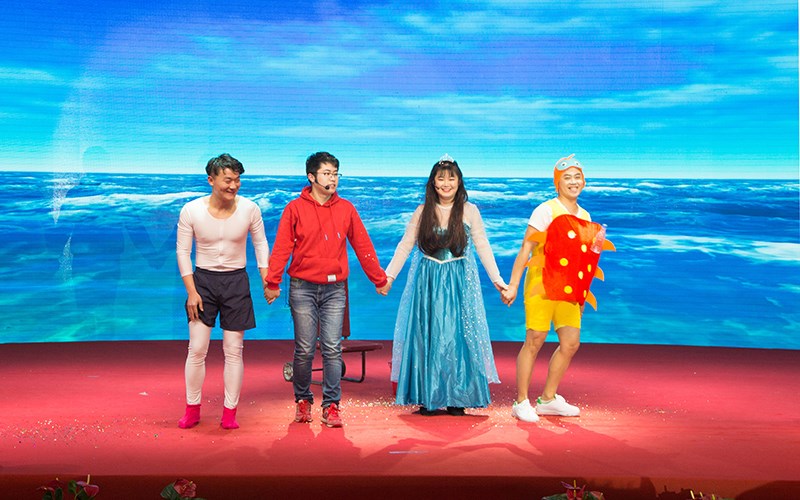 一開場,歌曲《我們不一樣》就點燃了全場,來自集團(tuán)總部4名演唱者,略帶金屬質(zhì)感的嗓音,深情唱出集團(tuán)20年艱苦創(chuàng)業(yè)中,聯(lián)橋人不一樣的拼搏,不一樣的意志,不一樣的風(fēng)采,不一樣的兄弟情。尤其是當(dāng)1500名聯(lián)橋人揮舞著旗幟拍攝全家福的壯觀畫面呈現(xiàn)時,身為聯(lián)橋人的驕傲和自豪感油然而生。紡織服裝行業(yè)的情景劇《感覺自己棒棒噠》,表演輕松愉悅、風(fēng)趣幽默,歌聲傳達(dá)出紡織服裝行業(yè)的美女們,在緊張工作之中保持飽滿的精神狀態(tài)和積極樂觀的心態(tài),更表現(xiàn)著聯(lián)橋人追逐時尚,逐鹿世界秀場的風(fēng)采。塑料新材行業(yè)的歌曲《驕傲的少年》青春洋溢,4名帥氣小伙子的堅定歌聲,展現(xiàn)了他們開拓進(jìn)取的精神。人力資源行業(yè)帶來的歌伴舞《天邊》,用渾厚的聲音,闡述著追逐夢想、勇攀高峰的精神;行業(yè)部長們用“聯(lián)橋老兵”精神演繹了《新長征路上的搖滾》,盡顯搖滾的力量,撕裂的吶喊,縱情的釋放,給人以心靈的震撼。在歌舞串燒《蹦沙卡拉卡》中,來自日本上市人力資源公司的CEO松本先生驚喜亮相,用一首《朋友》講述著與聯(lián)橋人的長久友誼。